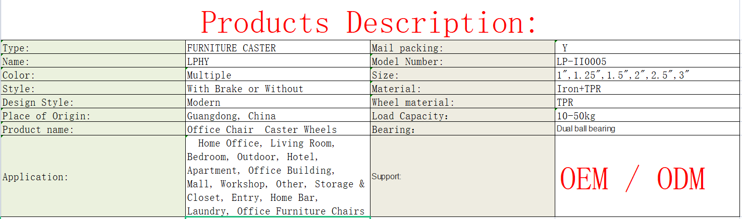 China Furniture TPR Casters Wheel Soft Rubber Silent Casters With Bearing For Office Chair TPE Caster-Brake compared with similar products on the market, it has incomparable outstanding advantages in terms of performance, quality, appearance, etc., and enjoys a good reputation in the market.LPHY summarizes the defects of past products, and continuously improves them. The specifications of China Furniture TPR Casters Wheel Soft Rubber Silent Casters With Bearing For Office Chair TPE Caster-Brake can be customized according to your needs.